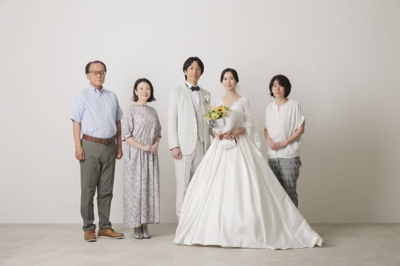 ブーケに向かって微笑むお二人をご家族様が見守りながらの撮影でした