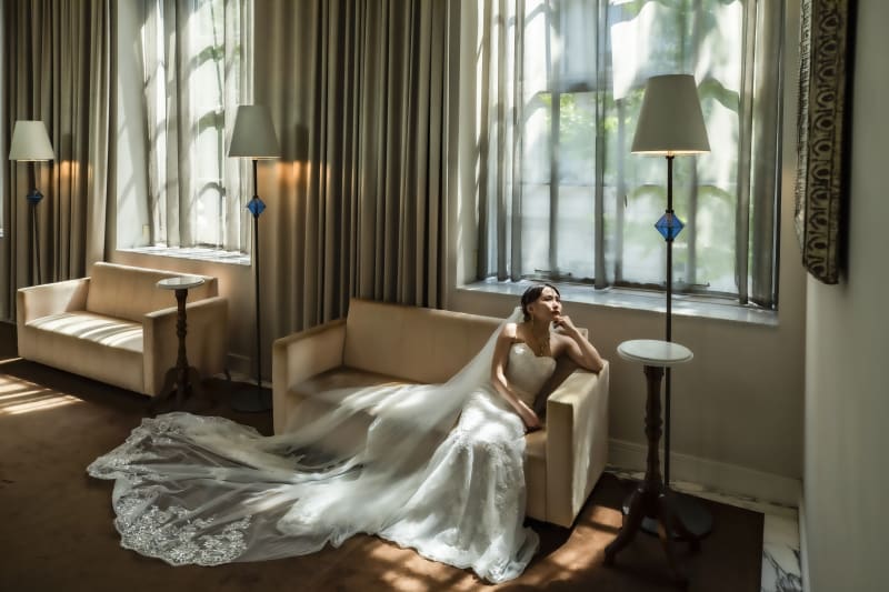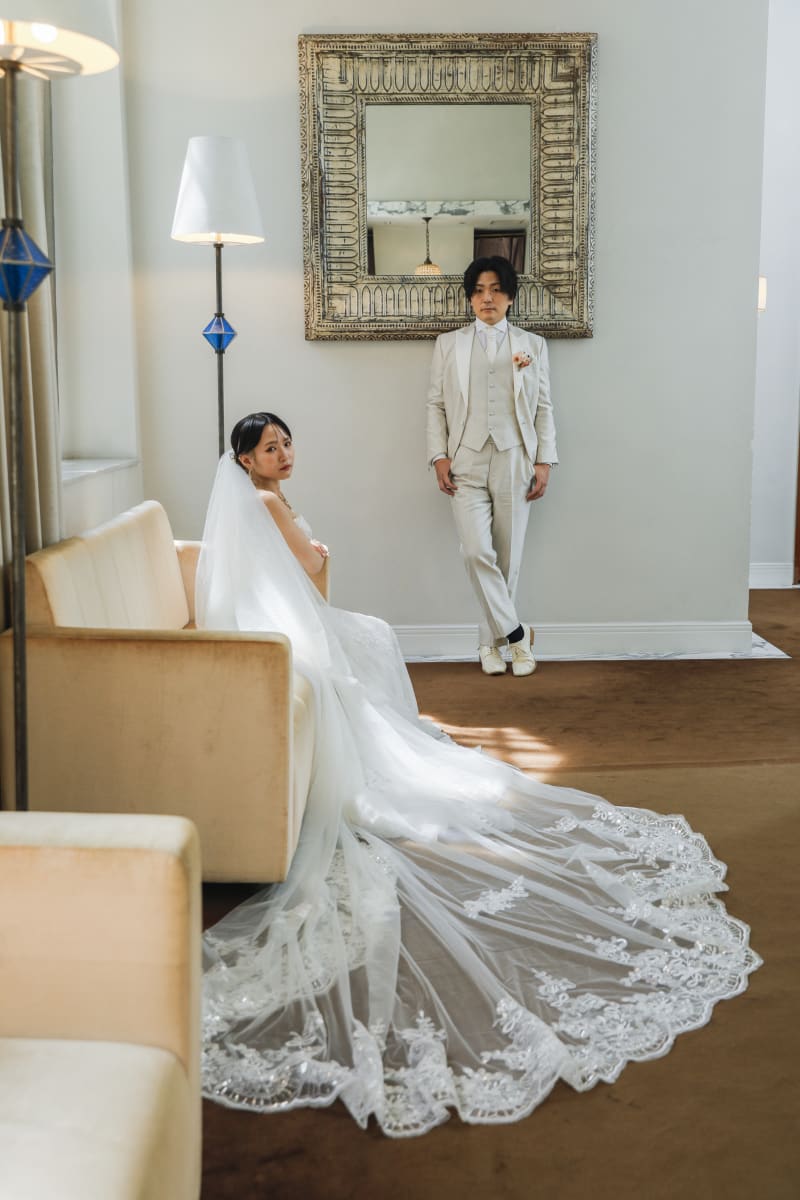 この美しく広がるベールは新婦様がお持ち込みされたもの。格式がいっそう高まります
