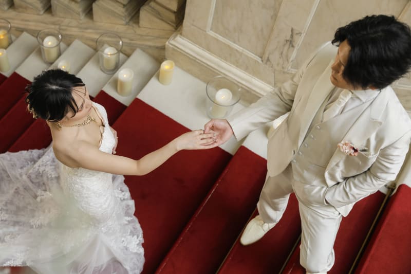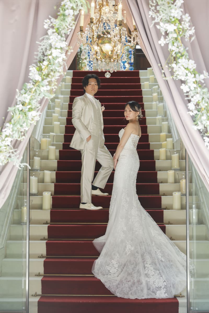 重厚な雰囲気の階段を新郎様がクールにエスコートします。