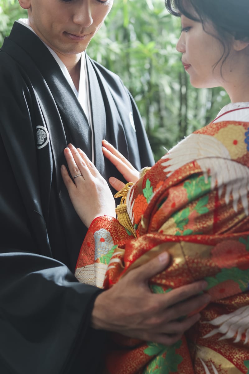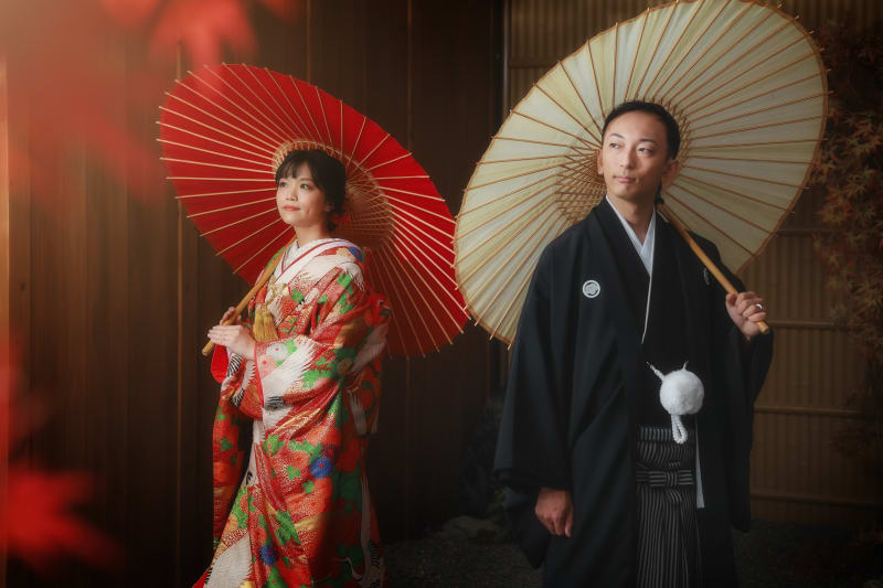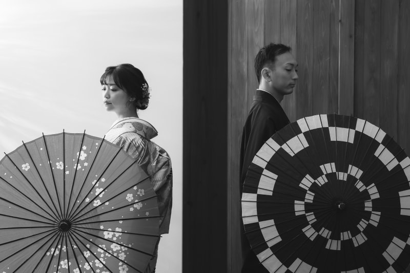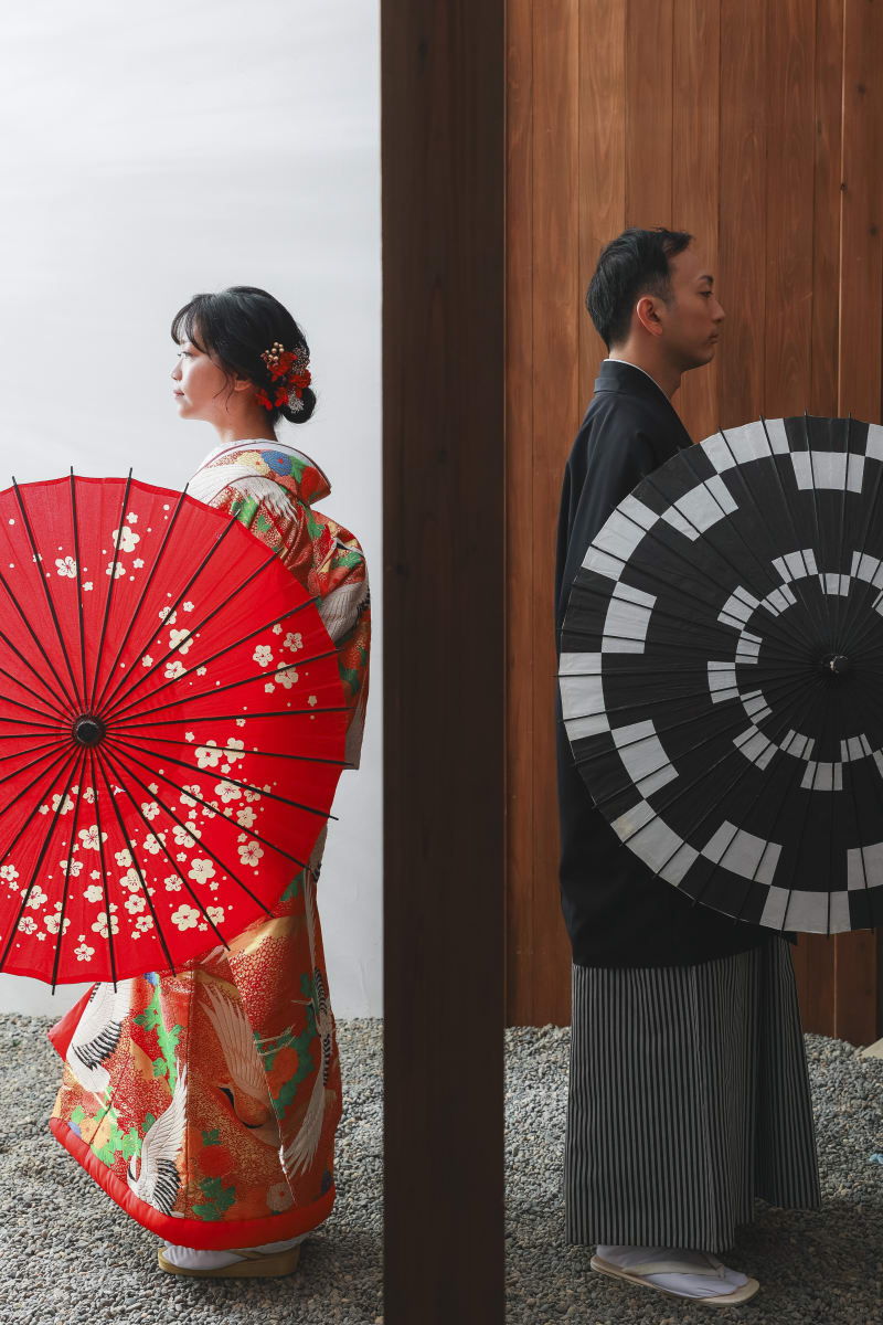 違う和傘を使って、お二人のお着物の色に合わせてバイカラーかっこよく撮影しました!!