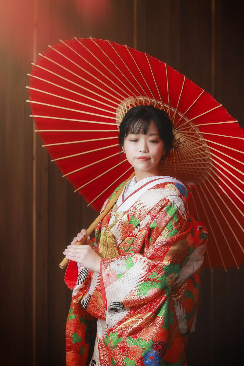 紅葉×色打掛×赤和傘 赤尽くしのお写真!!太陽光も差してエモですね^^
