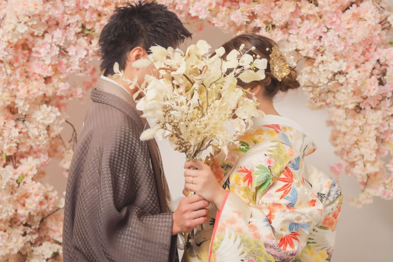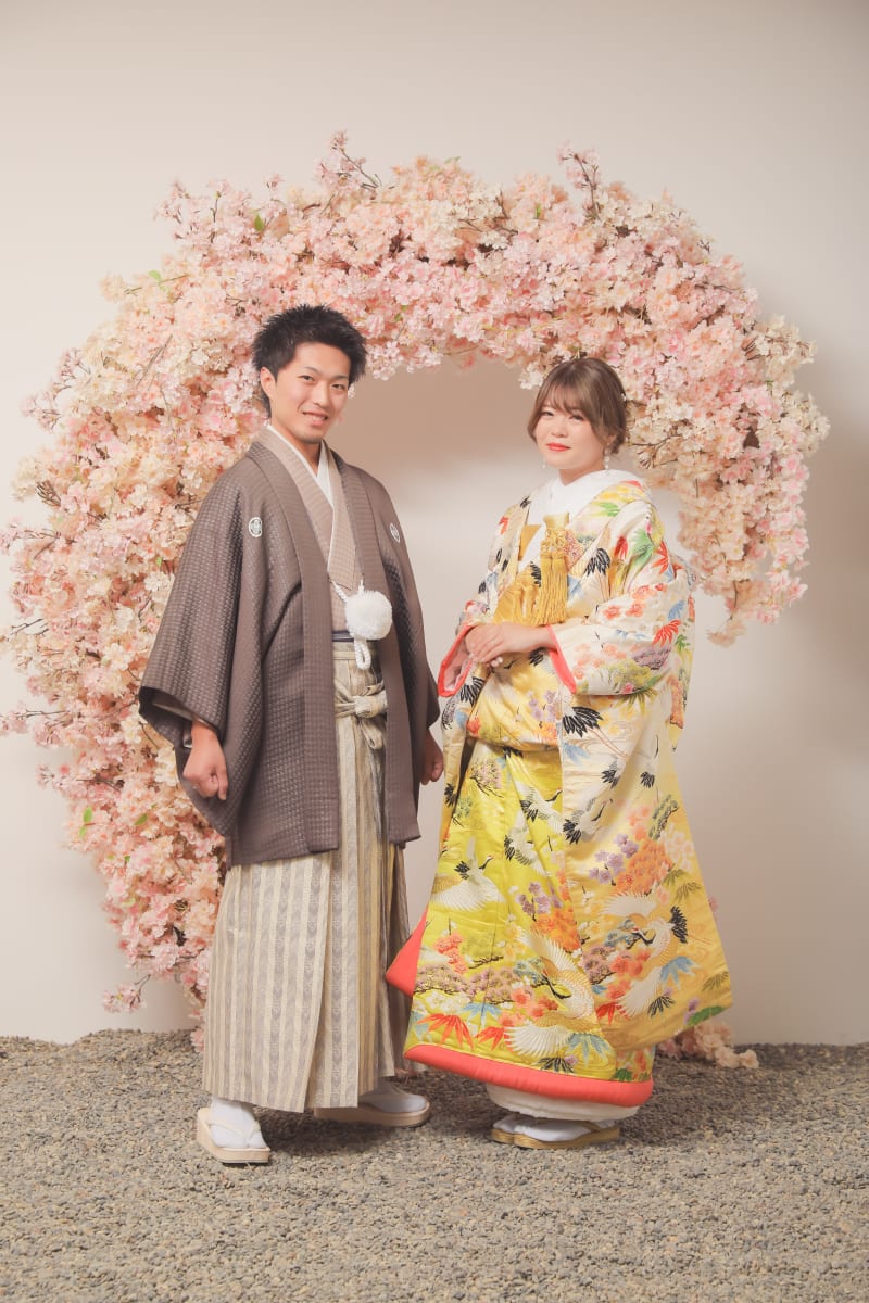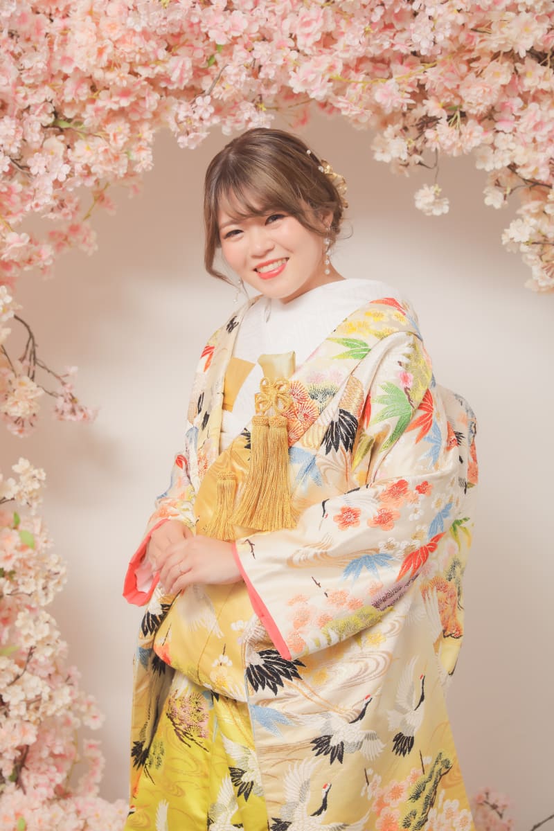 可愛らしい桜のアーチの前でソロカットをお撮りしました!お着物も桜も華やかで新婦様を引き立ててくれますね!