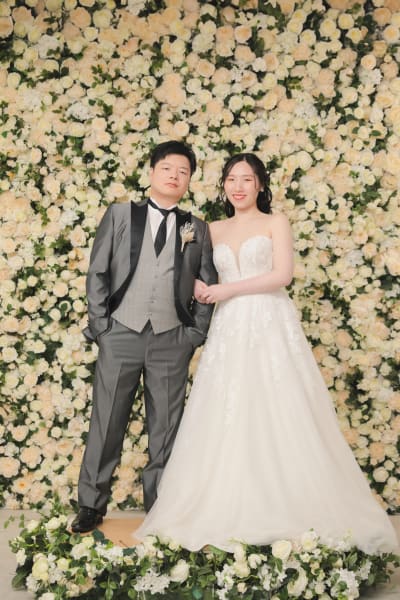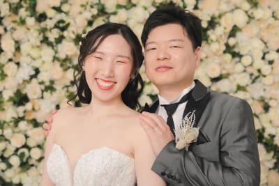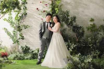 新婦様は純白のウエディングドレスを身にまとい、その美しいお姿に新郎様も自然と微笑まれていました。撮影はフラワーウォールから始まり、お二人とも楽しそうなご様子で、笑顔が絶えない場面がたくさんありました。
