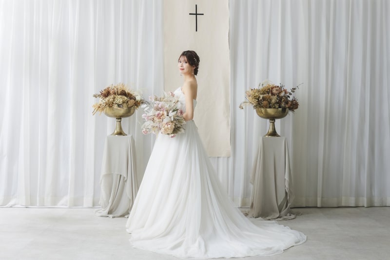 新婦様は美しいウェディングドレスに身を包み、その姿はまさに夢から飛び出してきたようでした。光の差し込むスタジオで、その輝く笑顔が一層引き立ち、シャッターを押すたびに新たな美しさを切り取ることができました^^