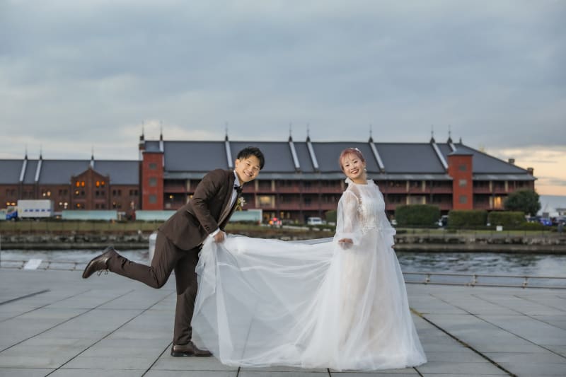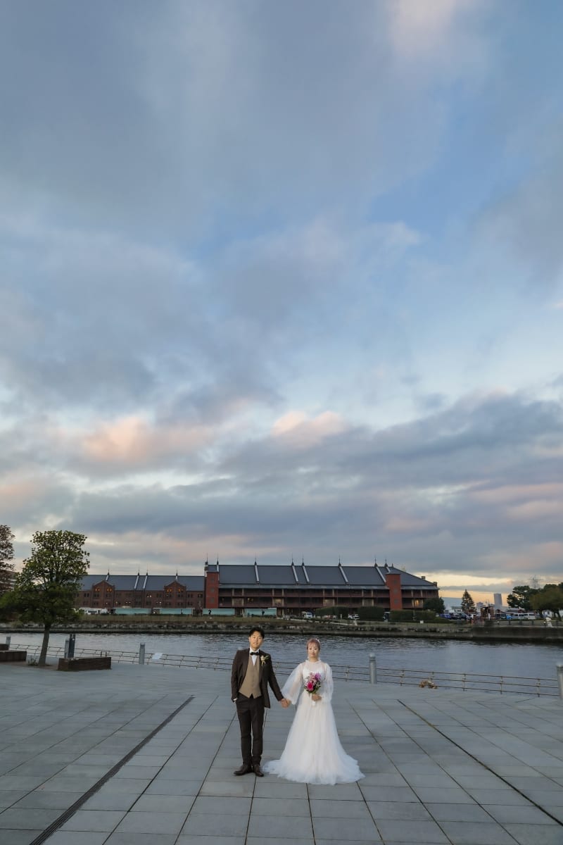 美しい夕暮れと赤煉瓦をバックに2人手を繋いで。