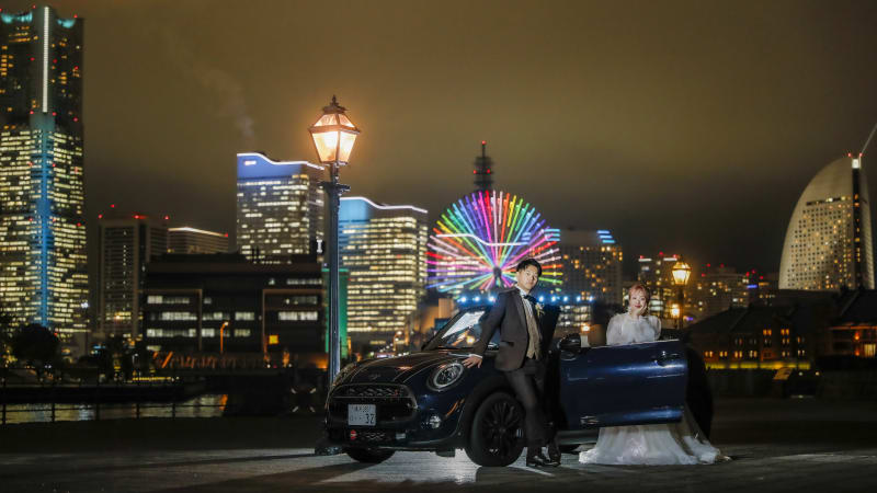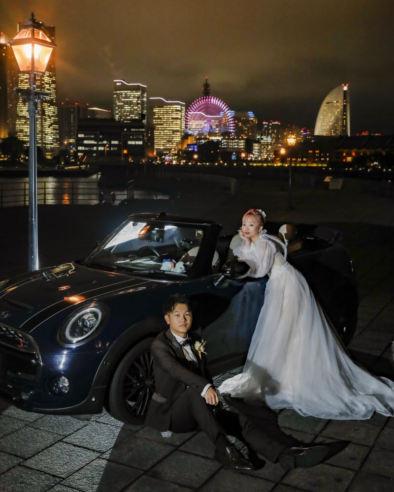 海の向こうのみなとみらいの灯りがクラシカルな車に合っています。
