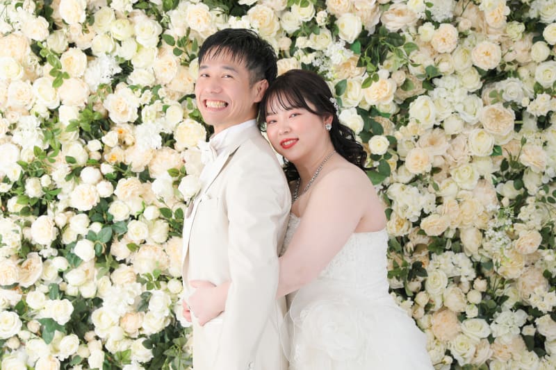 バラ一面で可愛く撮影! 後ろからバックハグ!新郎様嬉しそうですね!