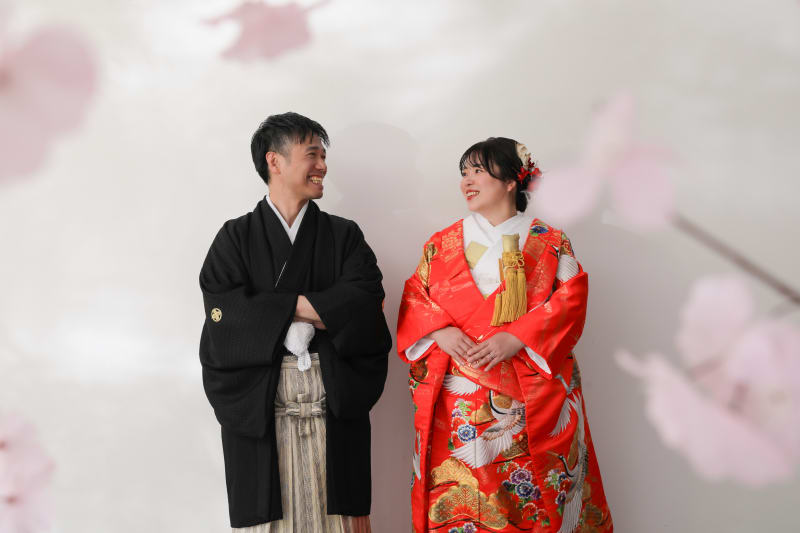 白背景で桜をいれてかわいらしく! お二人の着物が映えますね!