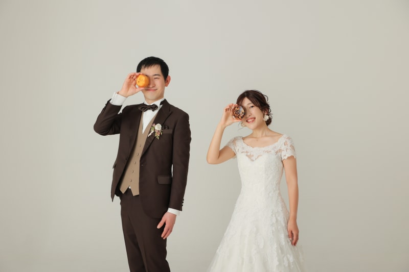 シンプルな白背景だからこそ、お二人のお衣装や表情がとっても引き立つ仕上がりに♡