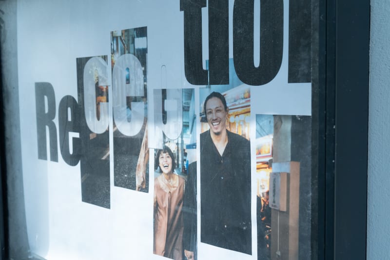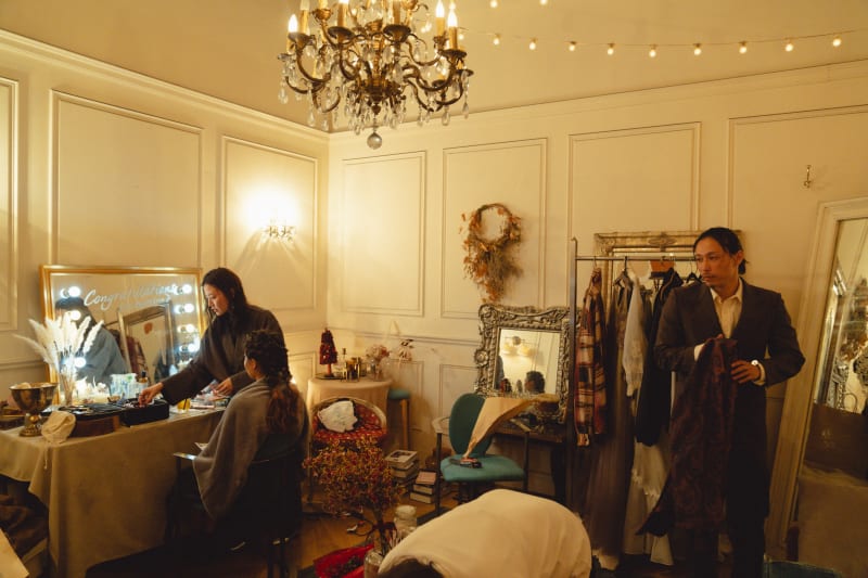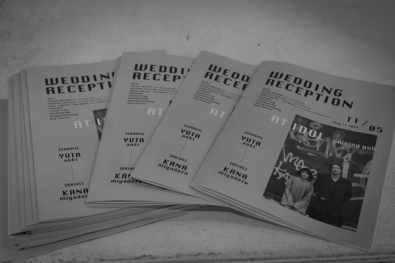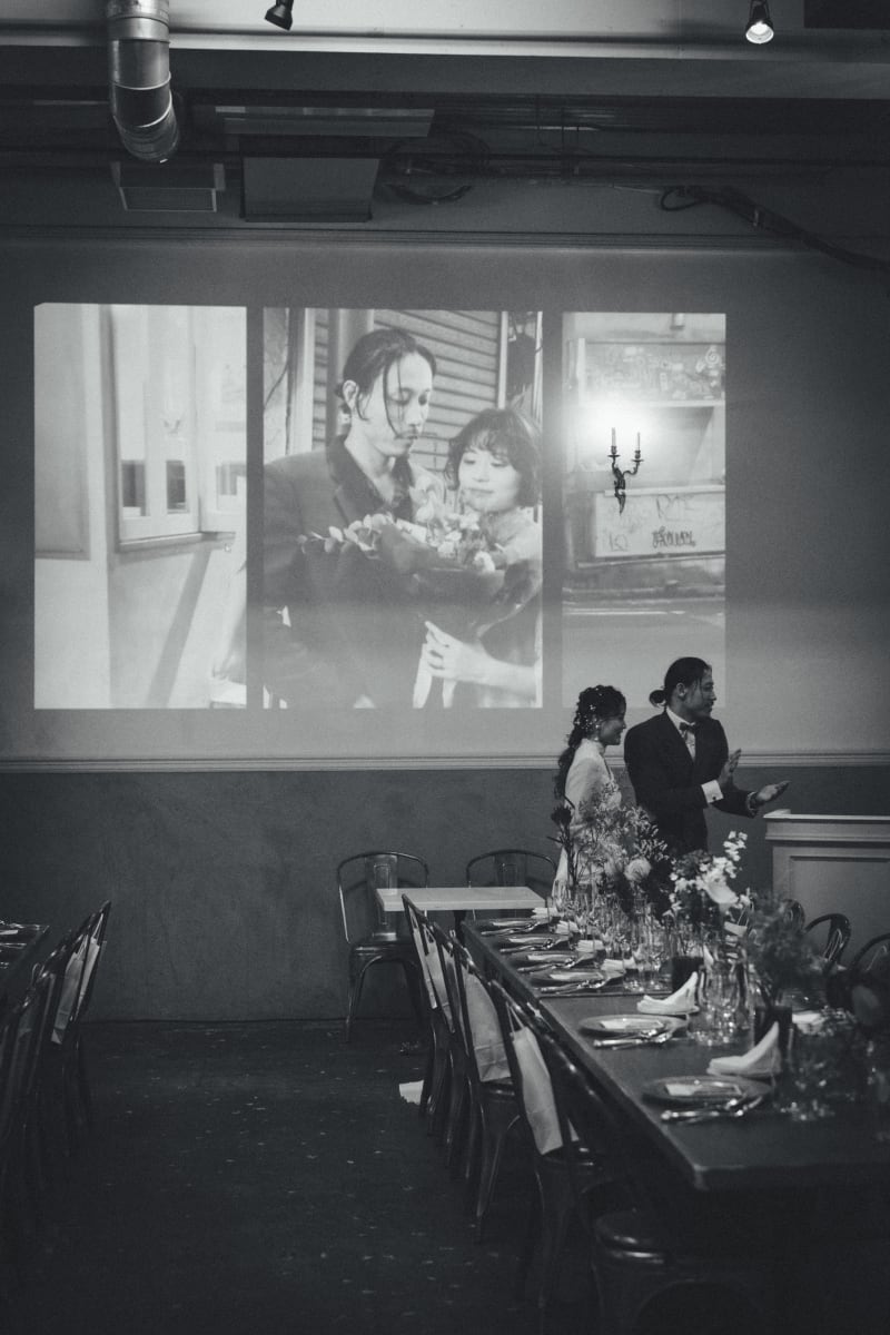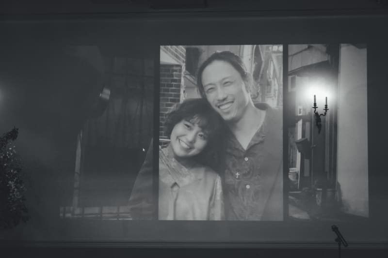 前方の大きな白い壁には、前撮りで撮影した野毛の写真たちが投影されています。