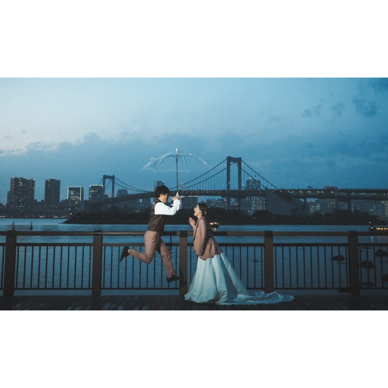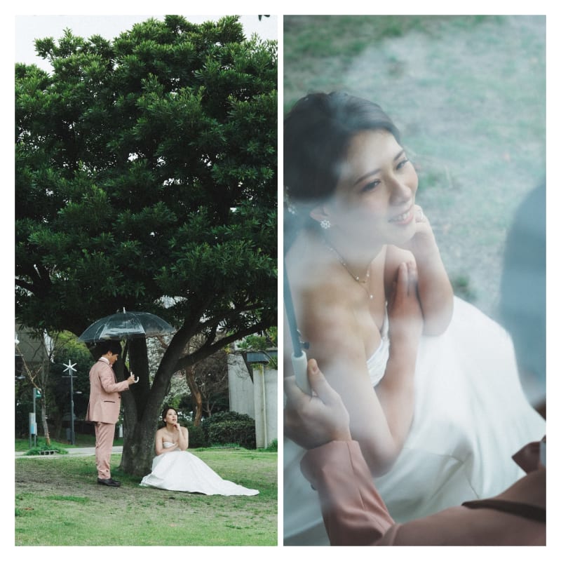 傘を使って撮影しましょうとなり、新郎さまが雨宿りしてる新婦様を迎えにいくというシーン。