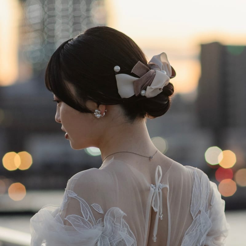 ヘアアクセサリーもビジュー系ではなく、ベロアリボンとパールピンで韓国らしさを出しているのもポイントです!