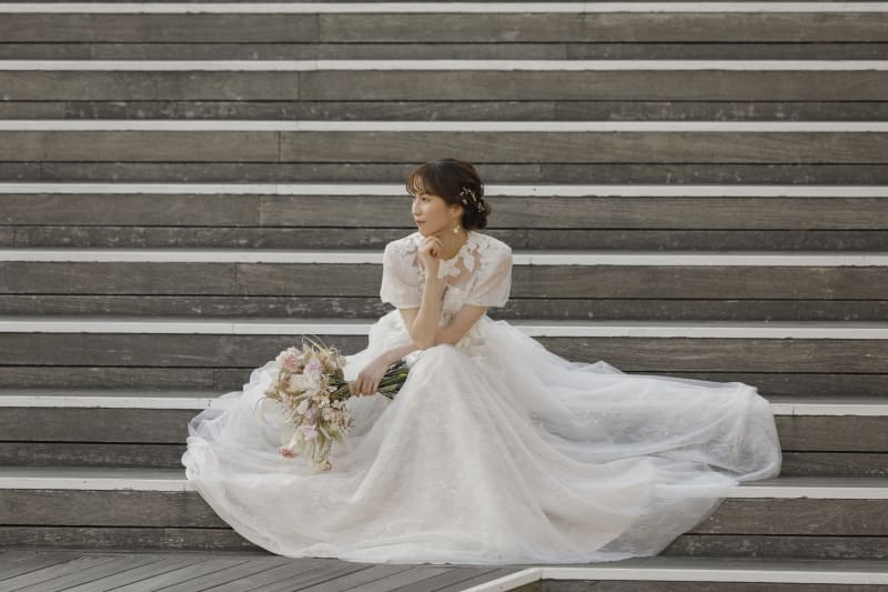 ドレスの透け感を活かしたバックショット。良い感じの光が降り注ぎました。