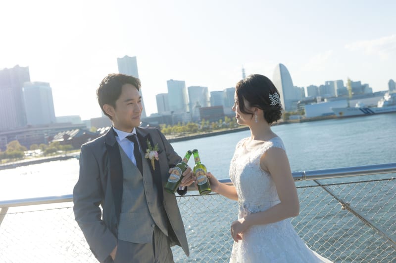 撮影の合間に、お酒で乾杯したり、出港する船に手を振ったり、リラックスした雰囲気が、新郎新婦の自然な表情を引き出し、写真に素晴らしい瞬間を収めることができましたね^^お二人にとっても、特別な思い出の1ページになったのではないでしょうか!それでは早速写真を紹介していきますよ