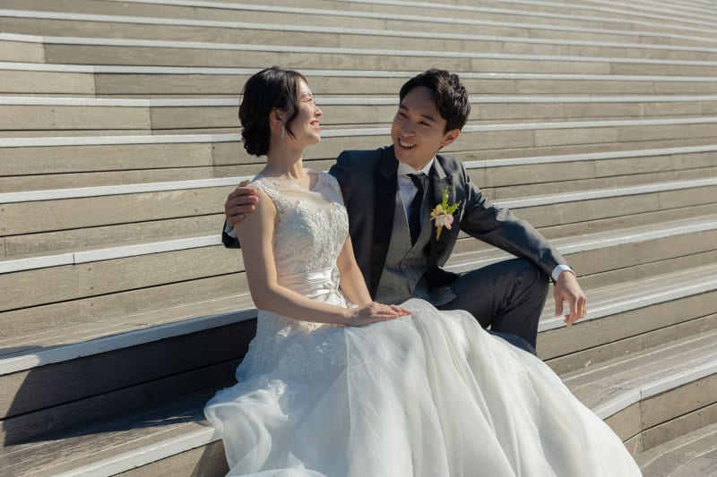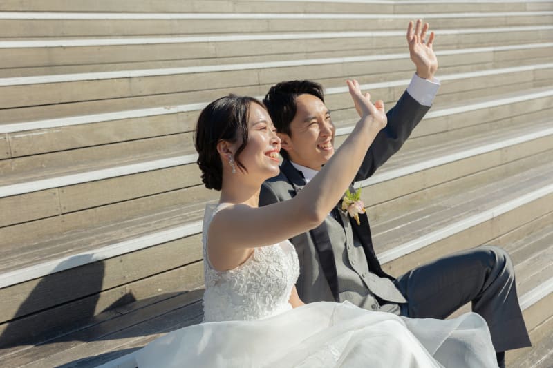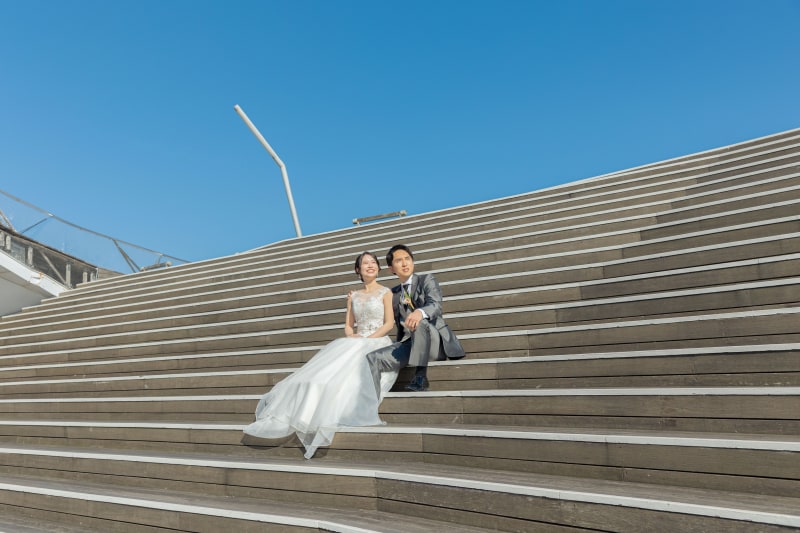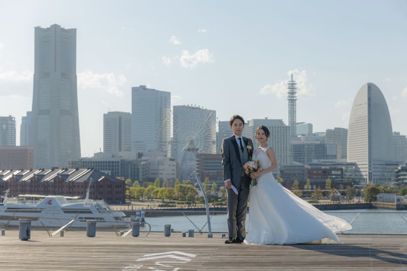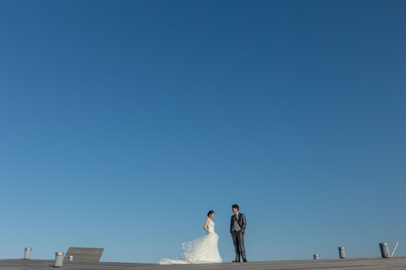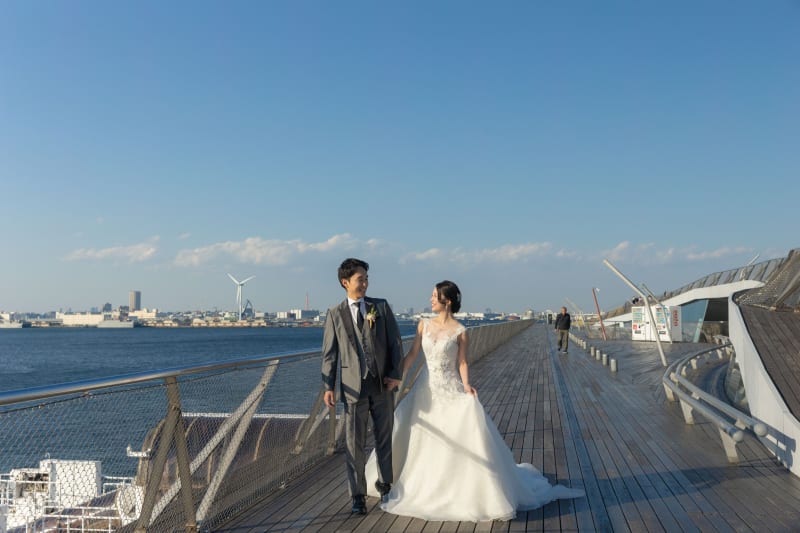 撮影当日は、雲一つない澄み切った青空が広がり、まさにウェディングフォトにぴったりの日でした。大桟橋の広々としたウッドデッキには、爽やかな海風が吹き、新郎新婦のお二人の笑顔がより一層輝いていました。