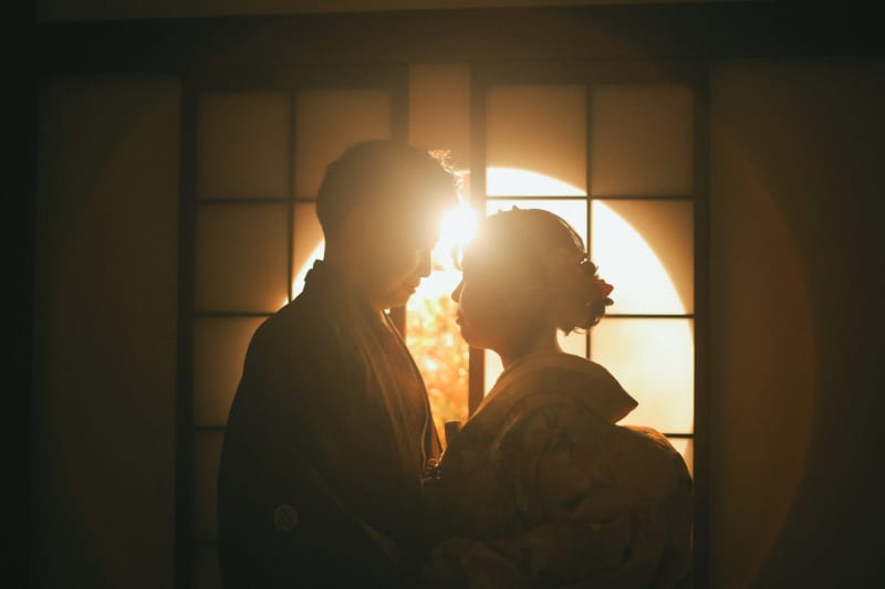 柔らかい自然光が降り注ぐ屋内庭園で、新郎新婦様のお二人の美しい和装がひときわ映える瞬間を捉えることができました。お二人の暖かい笑顔が印象的で、撮影の間ずっと幸せが溢れていましたね^^
