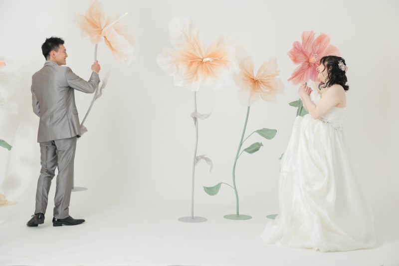 お次はインパクトばっちりなジャイアントフラワー! せっかくのなのでお二人で好きなお花を好きに置いていただきました♪