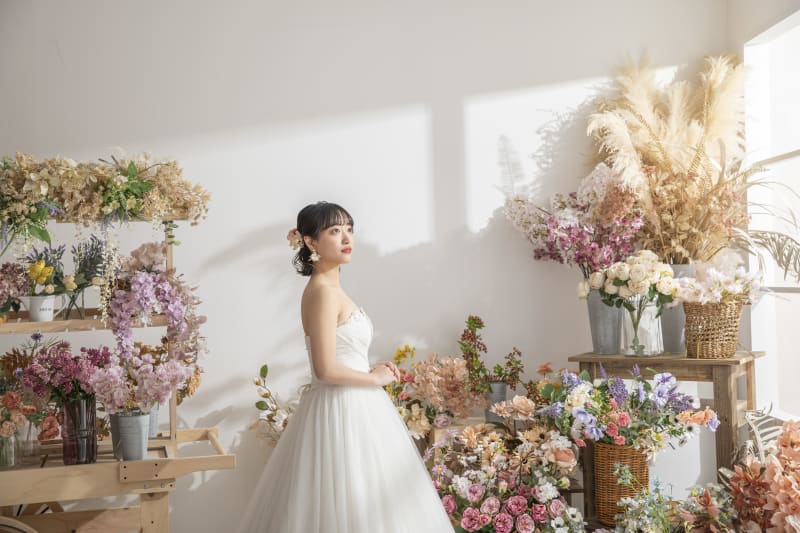 お花屋さんをバックに新婦様のソロショット。クールな表情も美しい。
