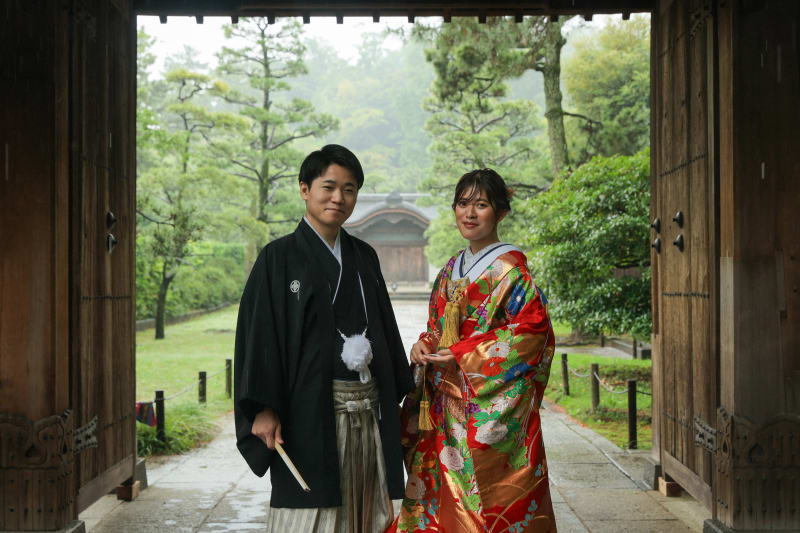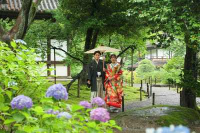 まず、撮影は三溪園からスタートしました。新婦さんは赤の色落ち掛けを身にまとい、その鮮やかな色合いが梅雨の緑豊かな庭園に見事に映えていました。