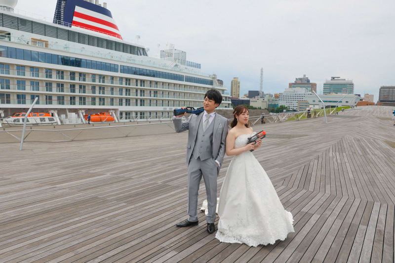 ドレスのラインが綺麗に映るように広めの画角で撮影しました。背景にいる船も迫力がありました!