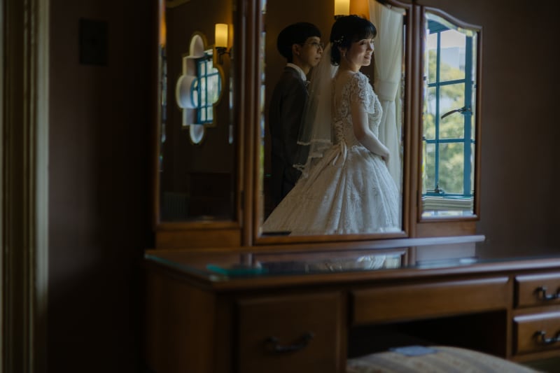 お二人をドレッサー越しに移したお写真です。工夫することでより幻想的なおしゃれなお写真を撮影することが出来ました!