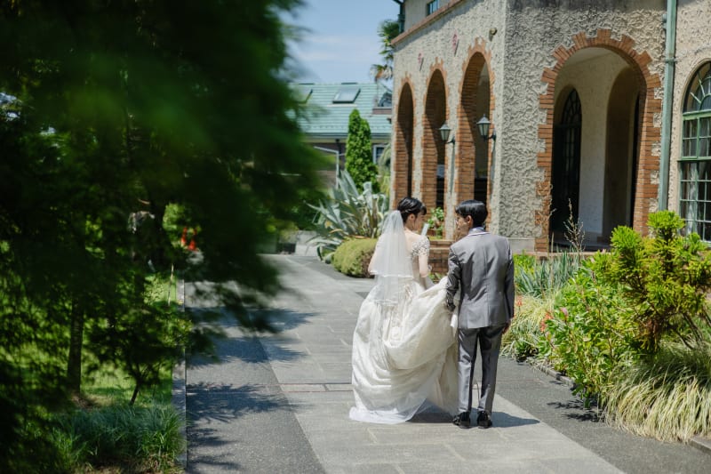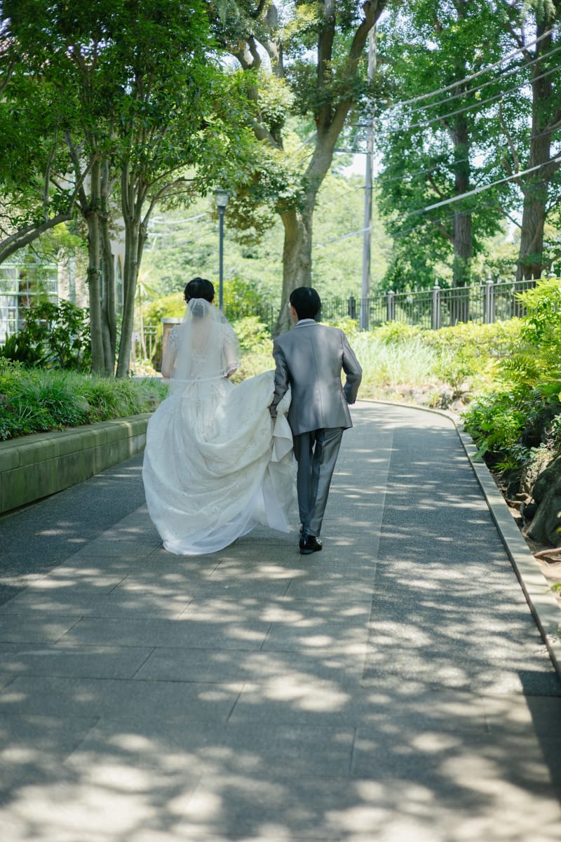 まずは、撮影場所まで向かうお2人の後ろ姿です。緑に囲まれて自然の優しい感じがいいですね♪