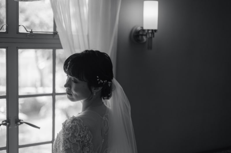 モノクロのお写真も。新婦さんのソロカットです!窓ガラスから遠くを眺めている姿が美しいです。