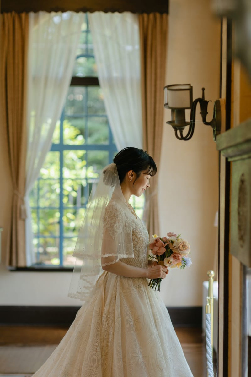 まるで映画のワンシーンのような綺麗な写真ですね!ブーケを見つめている新婦さんとても美しいです!