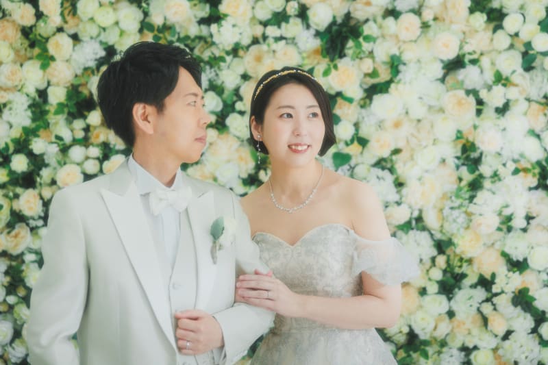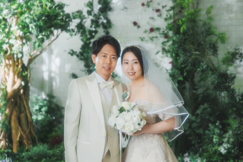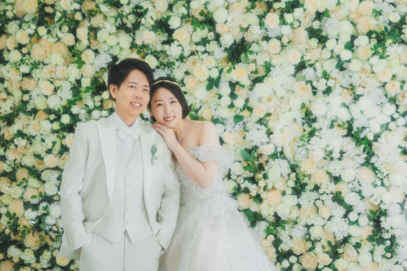 お二人のソロカットです!散りばめられた緑と白のバラがとっても映える写真です^^