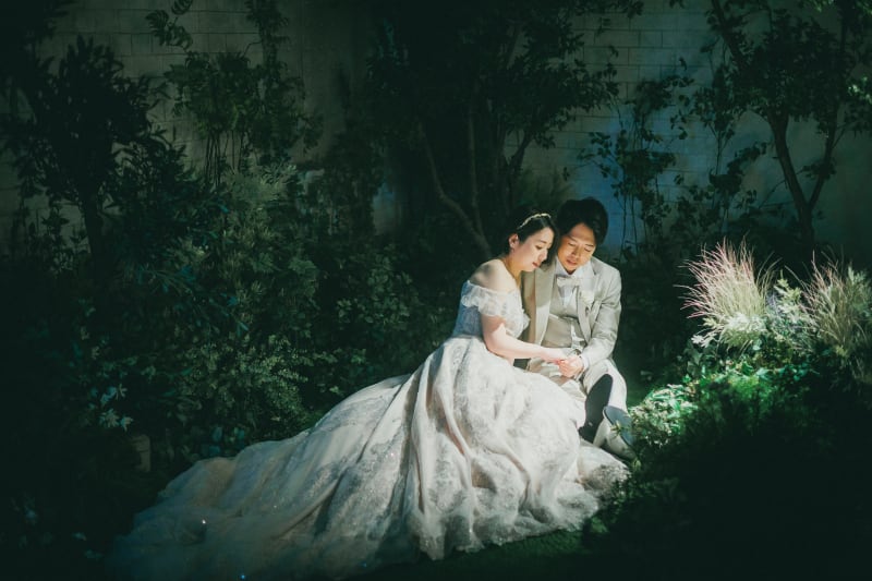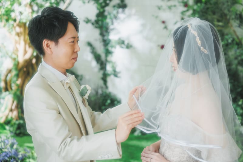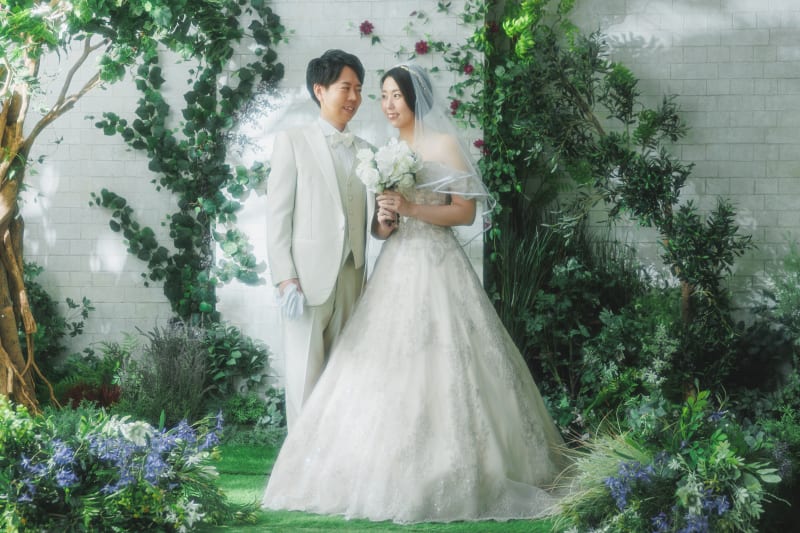 つぎはガーデンの背景でベールやブーケを使って華やかに。