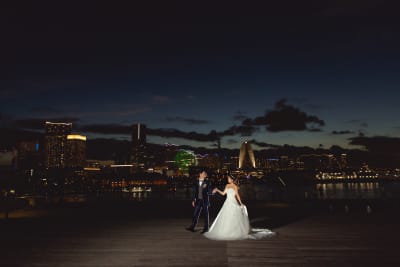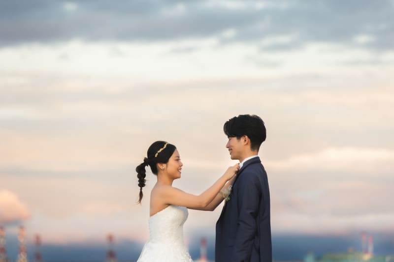 オレンジ色に染まった空を背景にお二人の姿をシルエットで撮影しました。夕暮れ時ならではのドラマチックで印象的な一枚になりました!