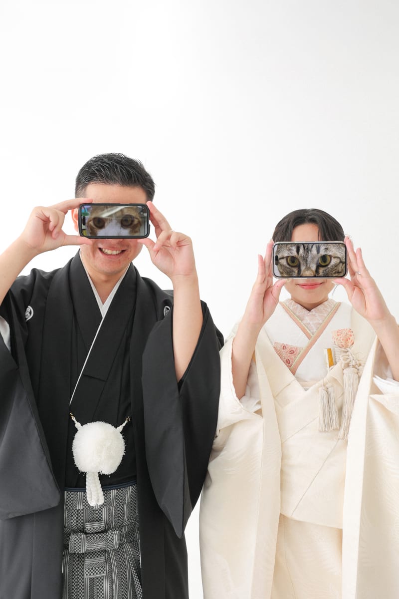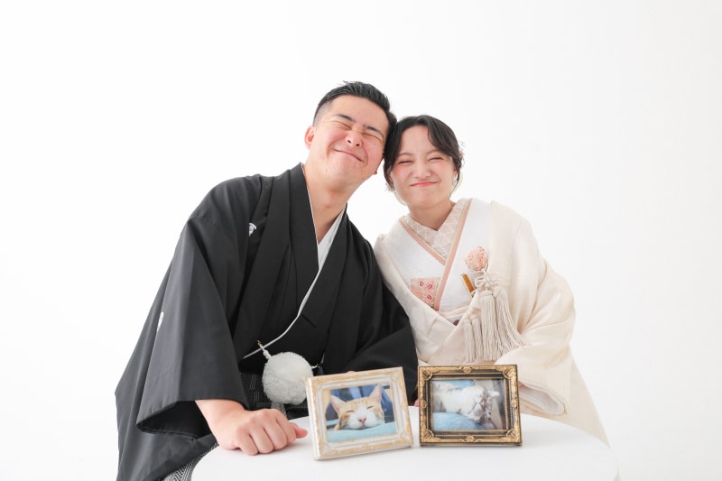 撮影時アイテムをお持ち込みいただくことが可能なのですが、今回はお二人が飼っている愛猫ちゃんたちのお写真を持ってきてくださいました!!