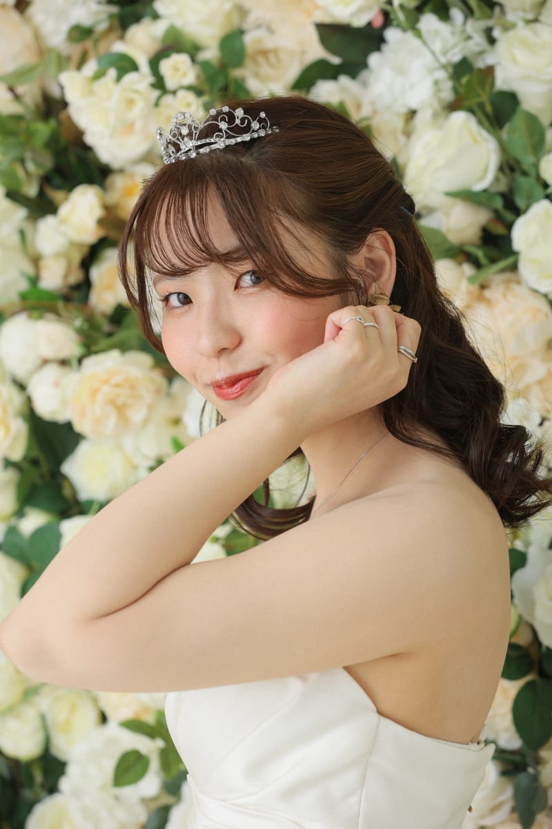 続いて白のドレスにお着替えです!ブーケも白に変えて、ヘアアクセサリーもティアラに変更です!