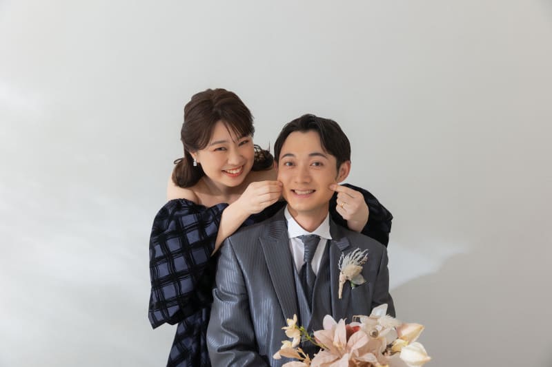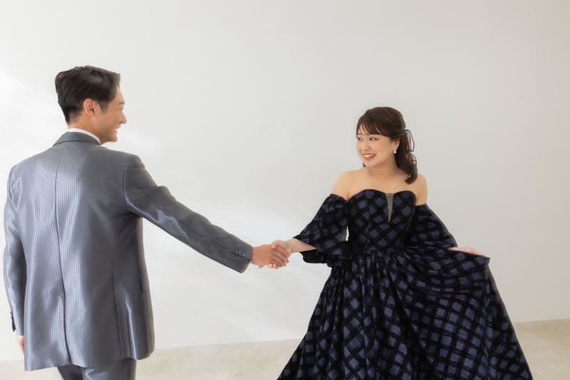 まずはスタジオで!シンプルな白壁で撮ってみました!紺のカラードレスがよく映えて素敵です^^
