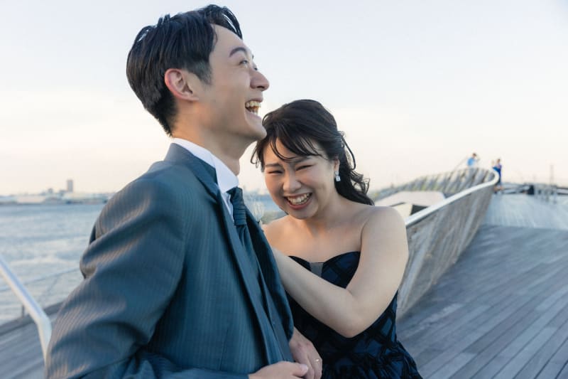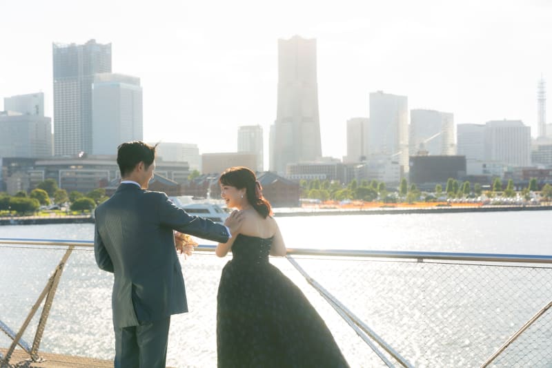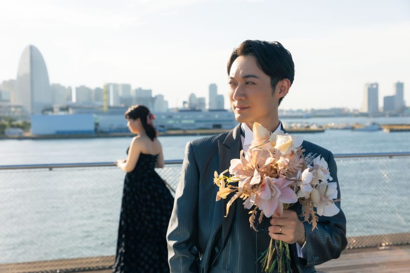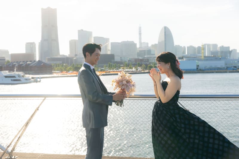 綺麗な海とみなとみらいを背景にブーケをプレゼントする新郎様!
