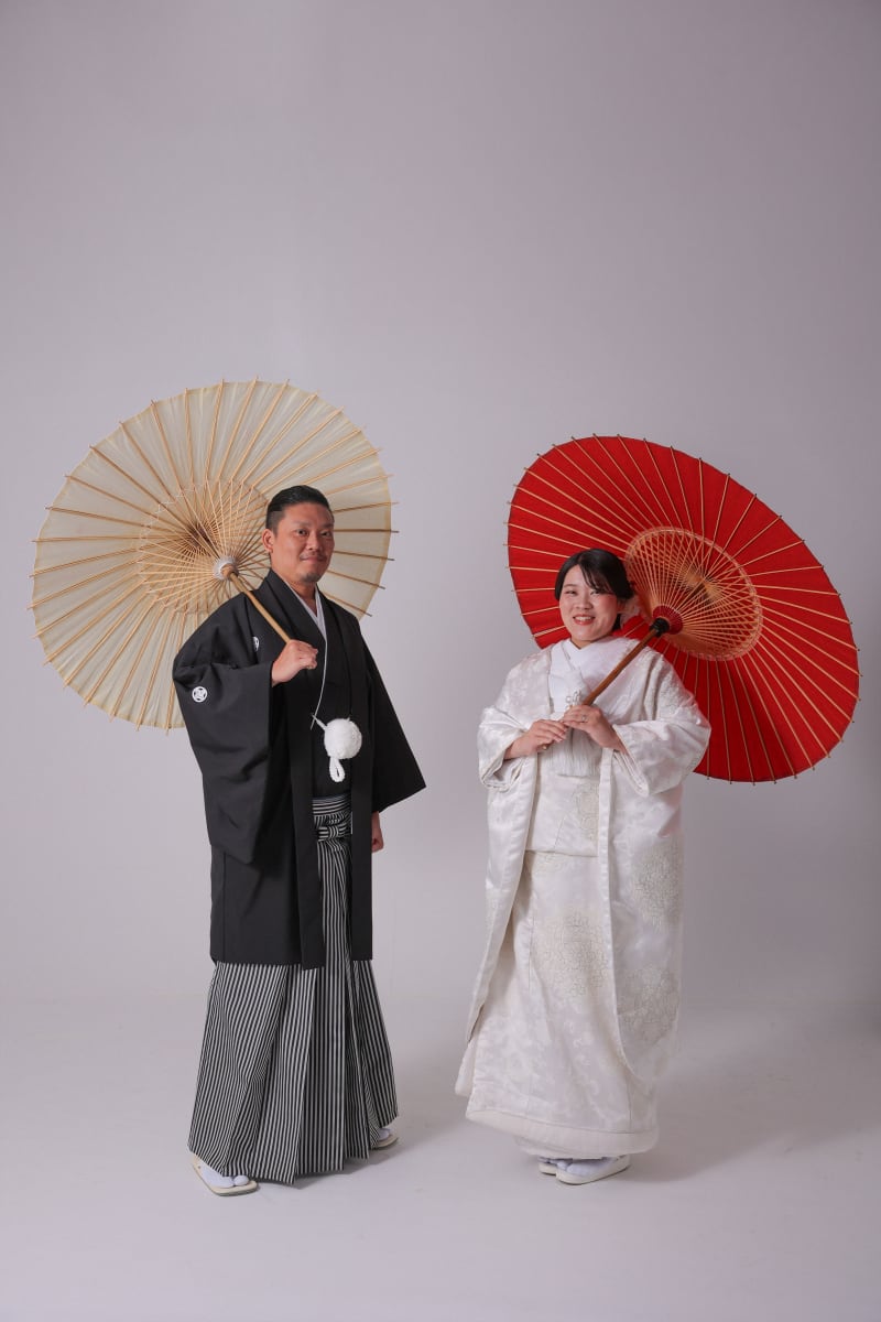 白背景で和傘を使うとすごく映えますね! 最初は緊張しているお二人でした!