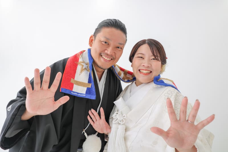 肩にタオルを巻いてもらい、応援風のお写真! 表情、完璧ですね!