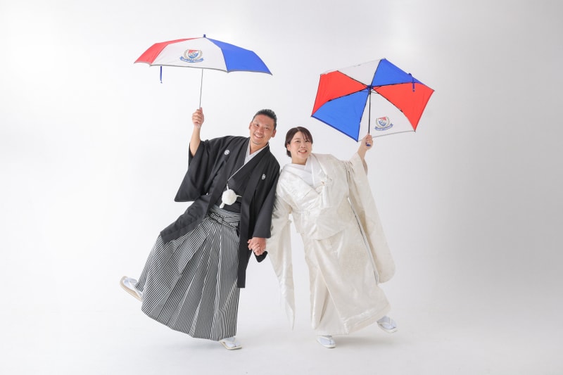 お二人の好きなサッカーチームの傘を使って撮影! 少し砕けた写真もいいですね