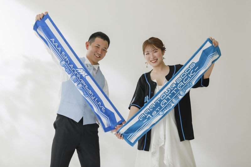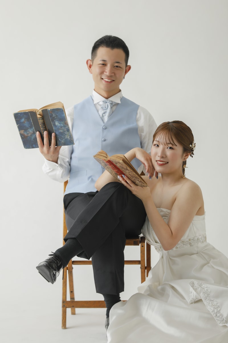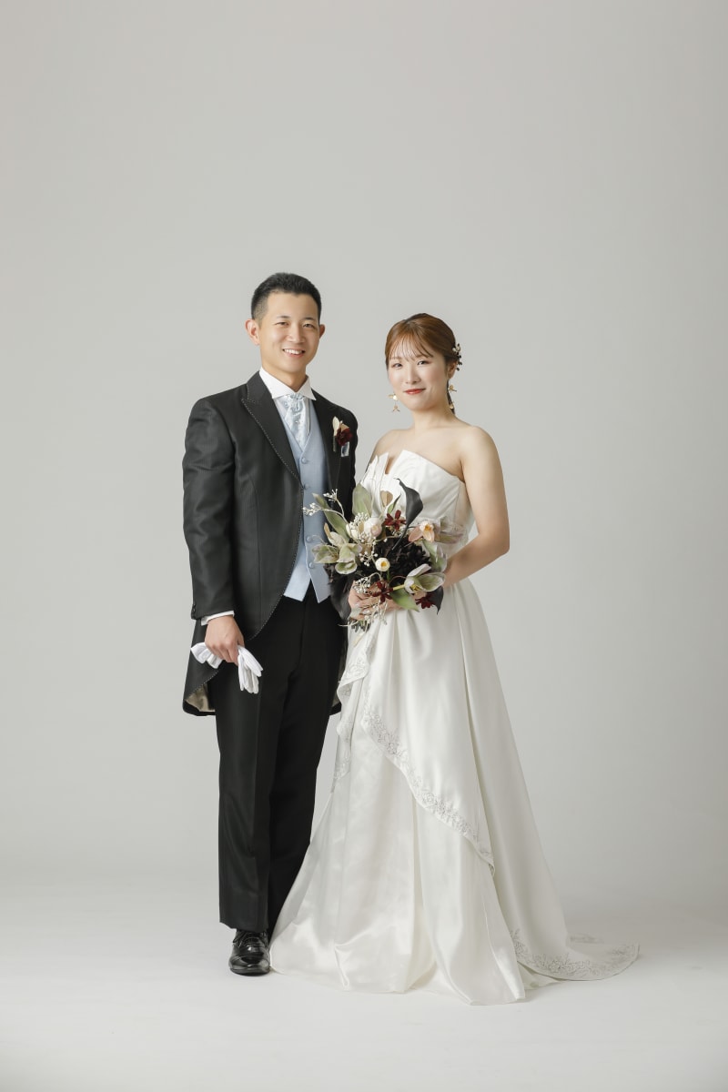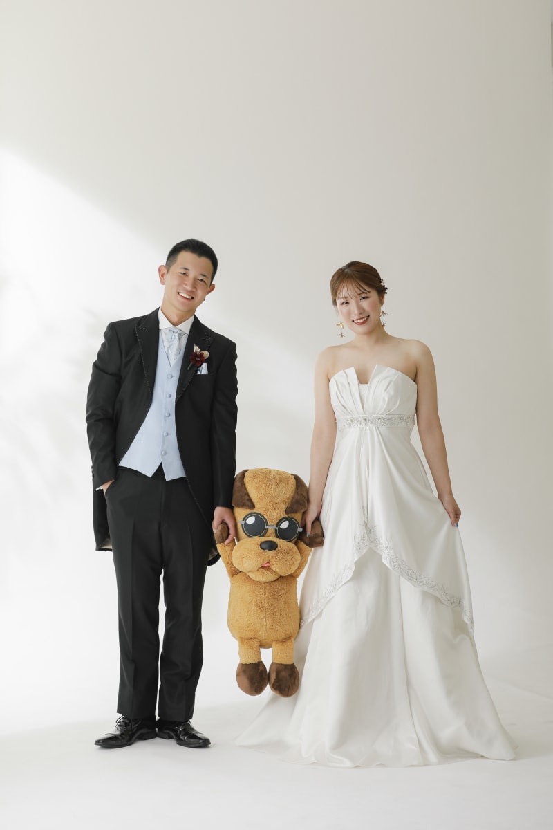 本日は洋装スタジオPLUSのご紹介です。このプランはシンプルゆえにお二人らしさが表現できるスタジオです。今回のお客様は好きなキャラクターと好きなアーティストのグッズを持ってきてくれました。