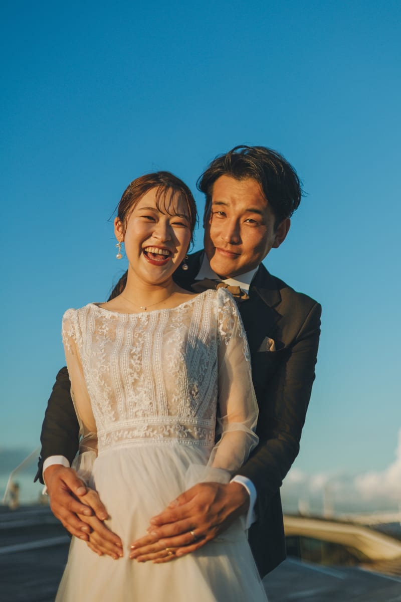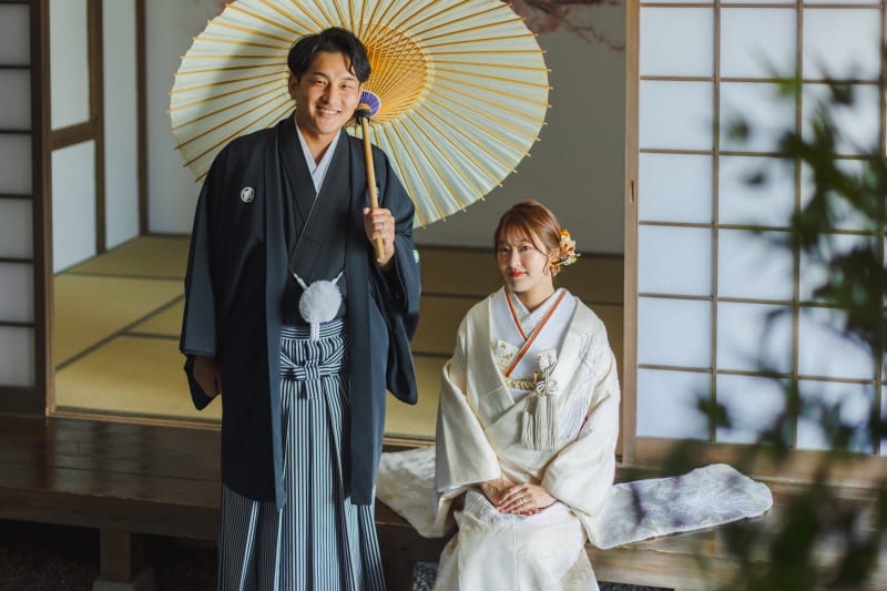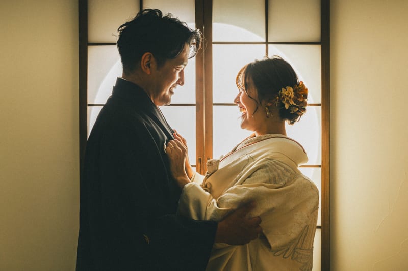 縁側で大人っぽい雰囲気の新婦さんと無邪気な笑顔を見せて頂いてる新郎さんとのギャップがいいですね!
