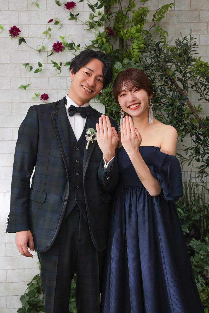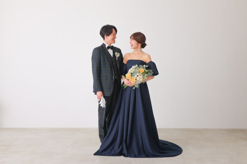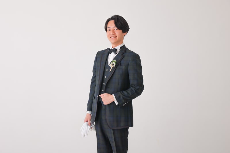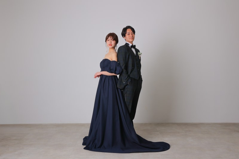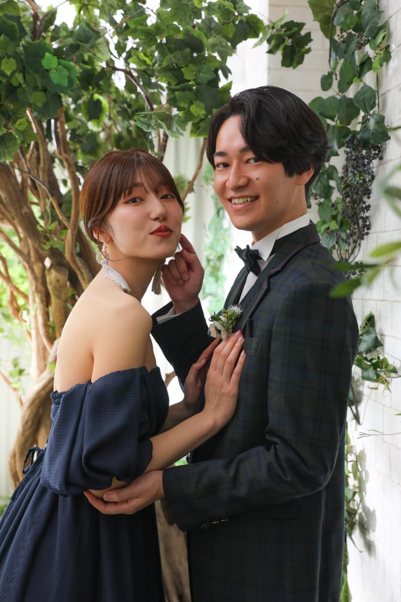今回お二人のお衣装は、新婦様は紺色のカラードレスで新郎様は濃い緑と青のチェックの衣装を着用して撮影していきました!お二人のコーディネートがお似合いでとっても可愛かったですね^^