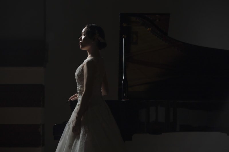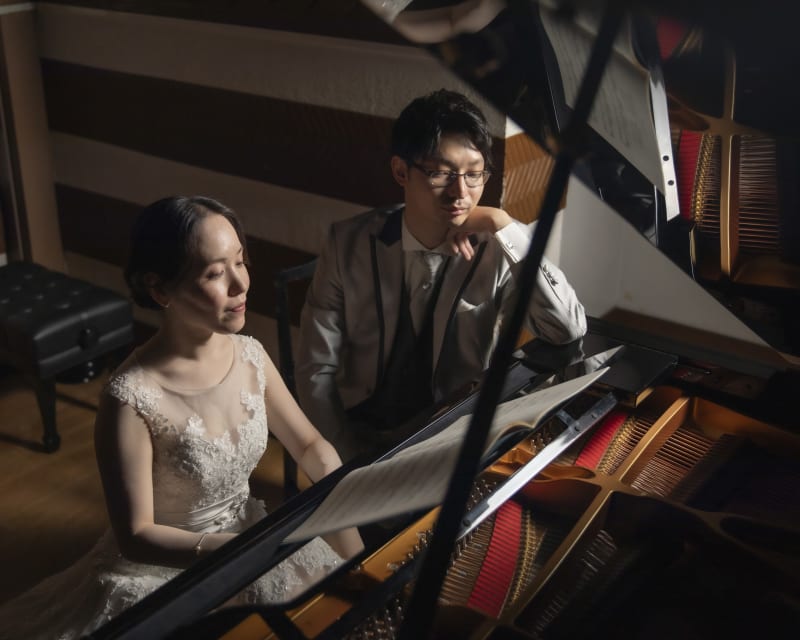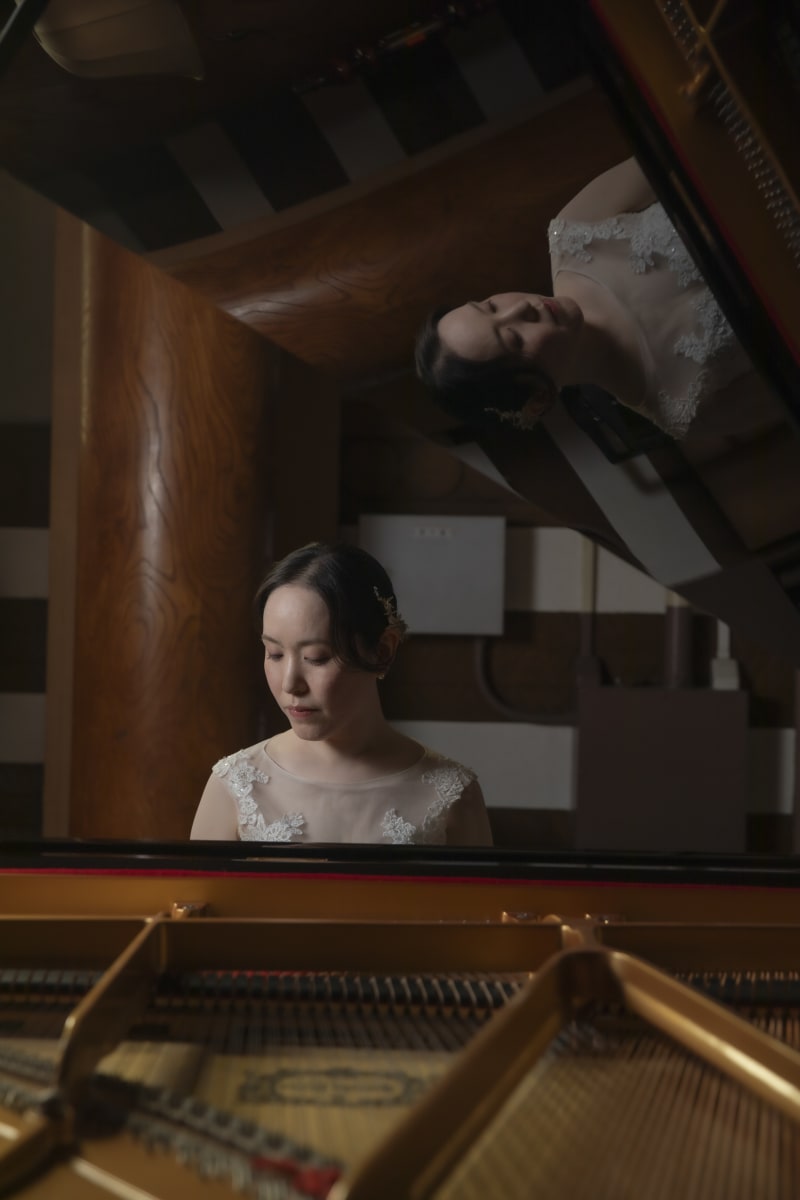 「二人で楽譜を見ている」がテーマ。グランドピアノの蓋に映り込む世界も美しい。