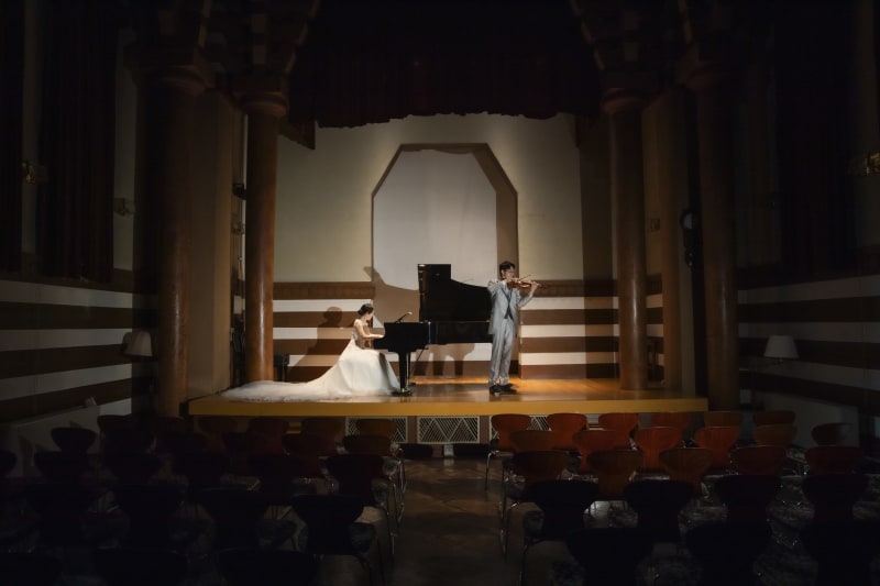大倉山記念館にはホールがあり、舞台にはグランドピアノが用意されています。今回撮影したのは楽器を演奏されるお二人。新婦様はピアノ、新郎様はヴァイオリン。このホールでは実際演奏もオッケーなので、お二人でセッションしてもらいながら撮影をしました。臨場感溢れる撮影ができました