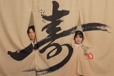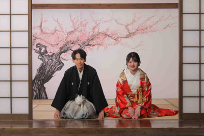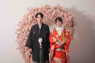 スタジオ内とは思えないほど自然な光に包まれた空間に、「寿」と書かれた暖簾や桜のアーチなど、季節感あふれる背景を取り入れて撮影を行いました。