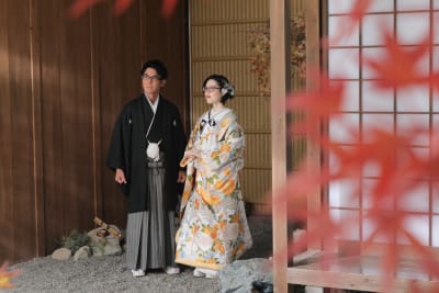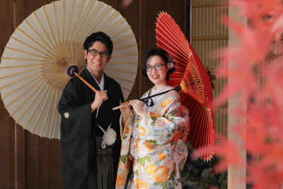 竹林では寄り添う二人が自然で可愛く、桜の前では一気に華やかに。暖簾では新郎様のちょっとお茶目な表情も撮れました。紅葉の落ち着いたセットでは、おふたりの大人っぽい一面がよく出ていて、とても良かったです。
