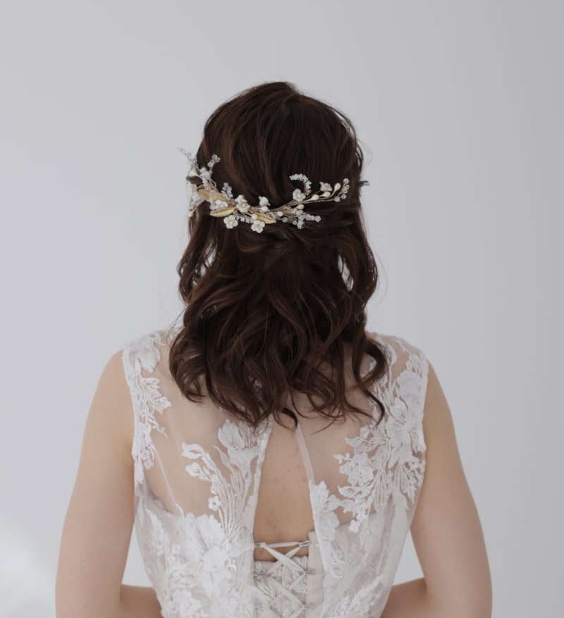 ヘアアクセサリーもドレスに合わせてナチュラル系のお花や葉っぱがついているものを選んでくださいました!可愛いですね