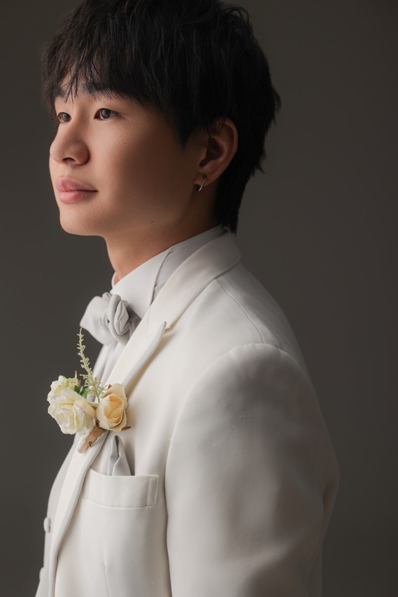 落ち着いた雰囲気に白いタキシードが引き立ち、とってもお似合いですね。
