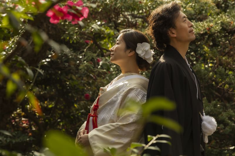 椿が咲き始めた一角で。赤のポイントが入った白無垢によく合いました。