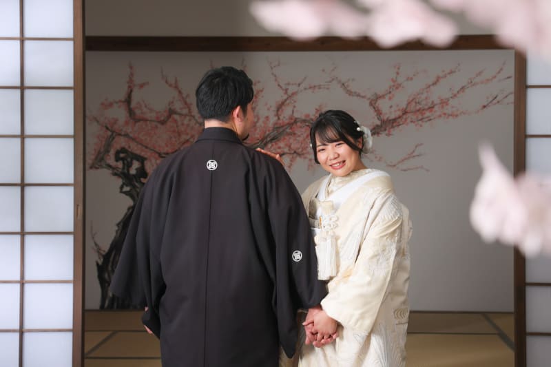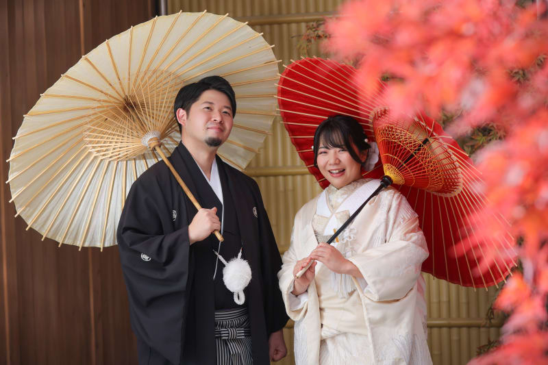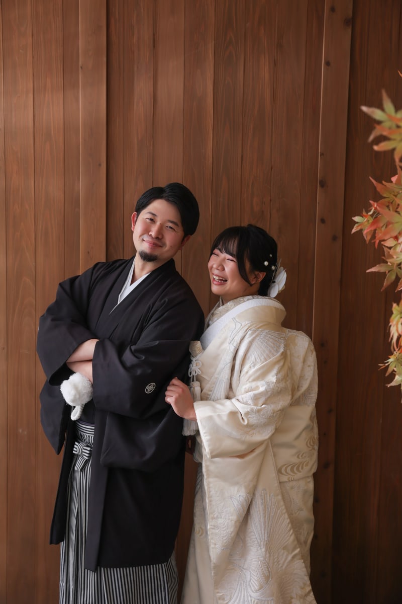 シンプルな背景で撮影です! お二人の笑顔が素敵ですね