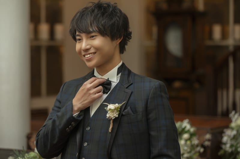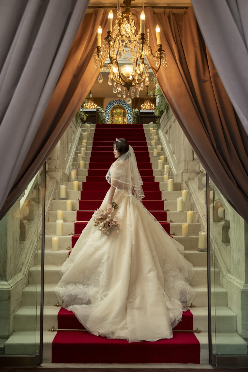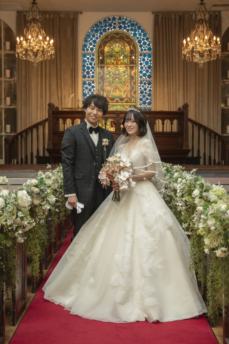 背景には年月を経たステンドグラス、天井からは柔らかな光が放り注ぎます。